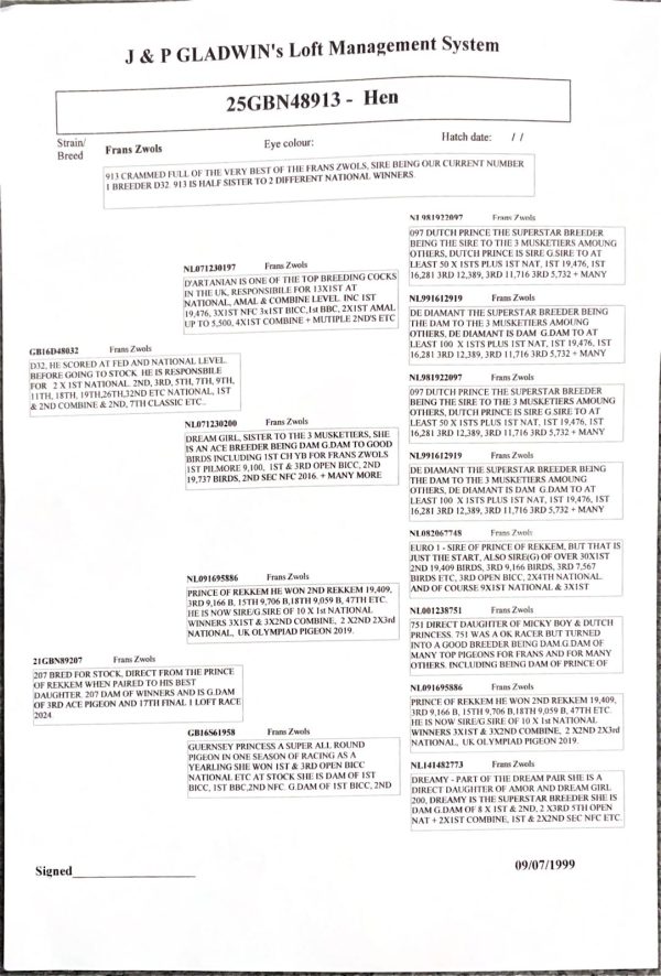 Dam of GB25N48913, is 89207 she is direct from two legends the Prince of Rekkem and his best daughter Guernsey Princess. Prince of Rekkem is responsible for 10x1st national winners, multiple combine winners and much more. Guernsey princess won 1st and 3rd national herself and dam of 2x1st and 2nd open National and much more. 89207 herself has bred winners and G,dam of 17th final and 3rd ace pigeon, in the UK premier 1 loft race in 2024. Priced at £1,000