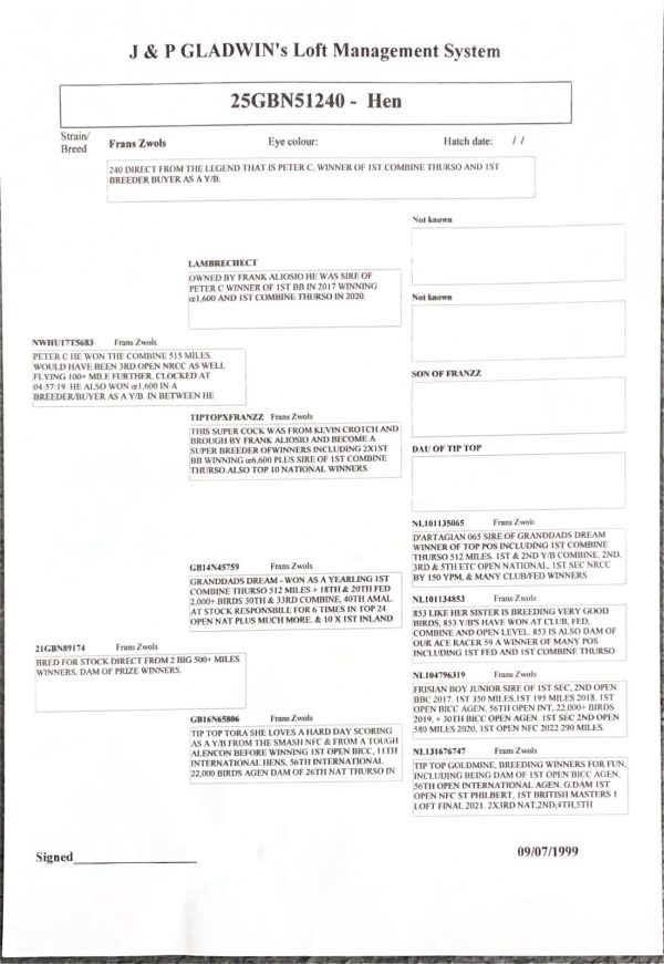 Dam of GB25N51240, is direct from the half brother and sister mating of Lazy Bones and Tip Top Tora. Lazy bones won 2nd national Narbourne and 30th National Agen, Tip Top Tora won 1st national Agen. Priced at £150