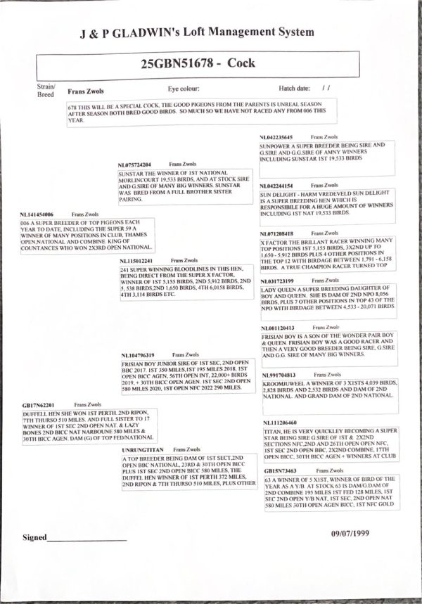 Dam is GB17N66201, the duffel hen, she was a good racer scoring right out to Thurso as a yearling, before going to stock where she is responsible for many winners, right out to 1st open NFC gold ring. She is a full sister to Lazy Bones and a half sister to Tip Top Tora, being from Frissian boy. Priced at £300